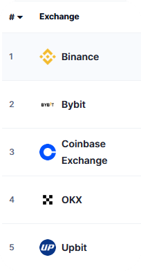 위의 이미지는 현재 비트코인 거래소 순위다. 바이비트와 OKX 같은 곳과 더불어서 업비트가 5위에 위치해 있습니다
